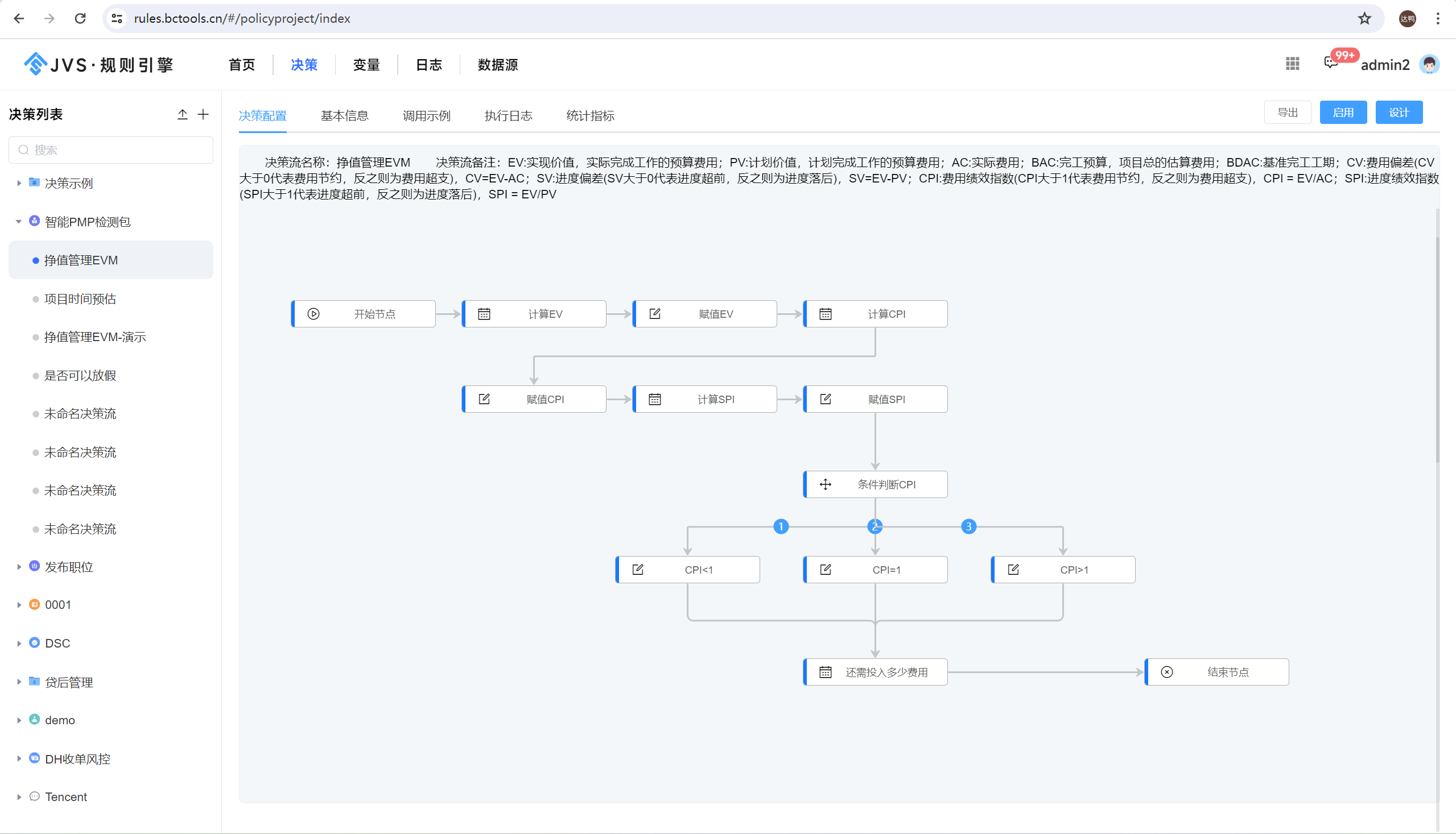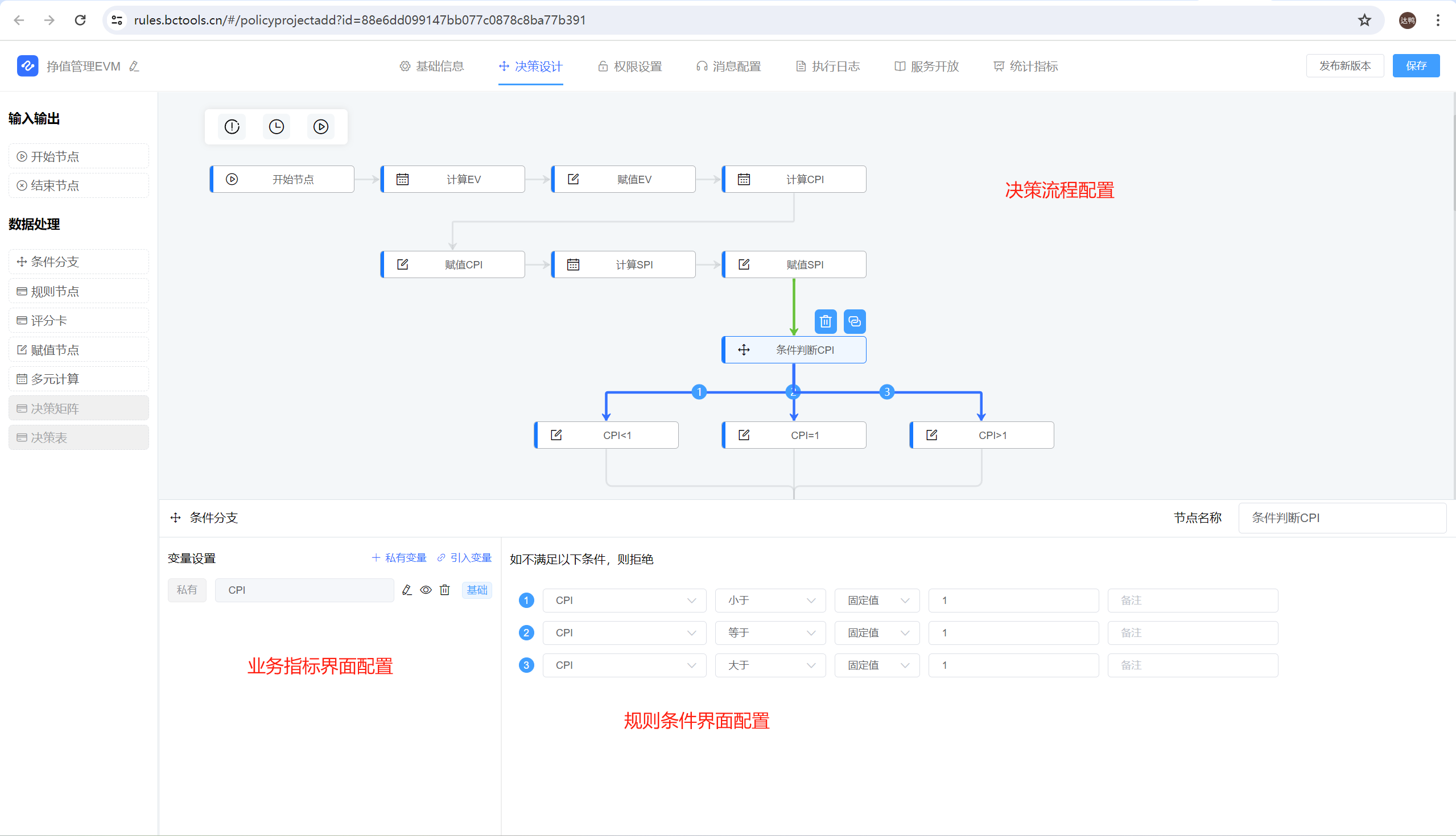 与声明式规则引擎不同,流程式规则引擎更注重规则执行顺序的可视化和流程管理。基于流程图的规则定义+业务判断指标界面加工的方式进行配置,使得用户可以直观地描述业务流程中的各个环节和规则之间的关系。典型产品如 jvs-rules,对用户操作非常友好