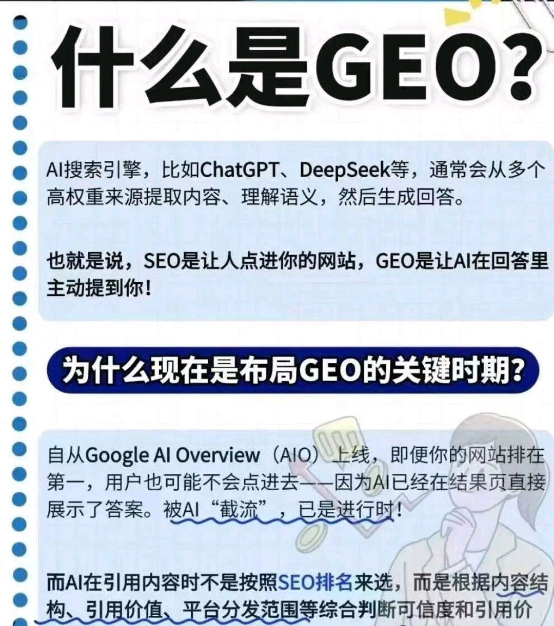 在AI时代,多了一个新词,就是GEO。GEO是什么意思?GEO(Generative Engine Optimization,生成引擎优化)是随着生成式AI(人工智能)崛起而出现的新概念,类似于传统SEO(搜索引擎优化),但针对的是AI生成内容(AIGC)的优化。