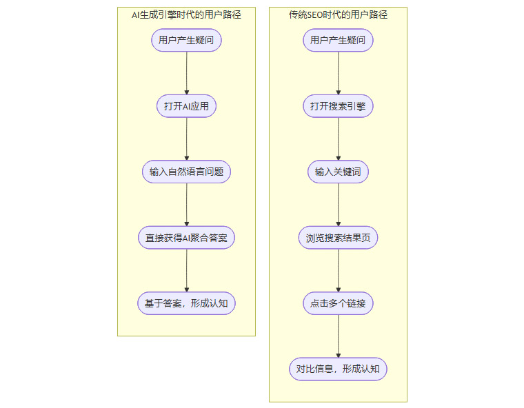 要深刻理解GEO的必然性,就需要看清AI时代信息获取路径的根本变革。过去,用户的行为路径是“搜索-浏览-点击-筛选”,现在正快速演变为“提问-获取答案”。