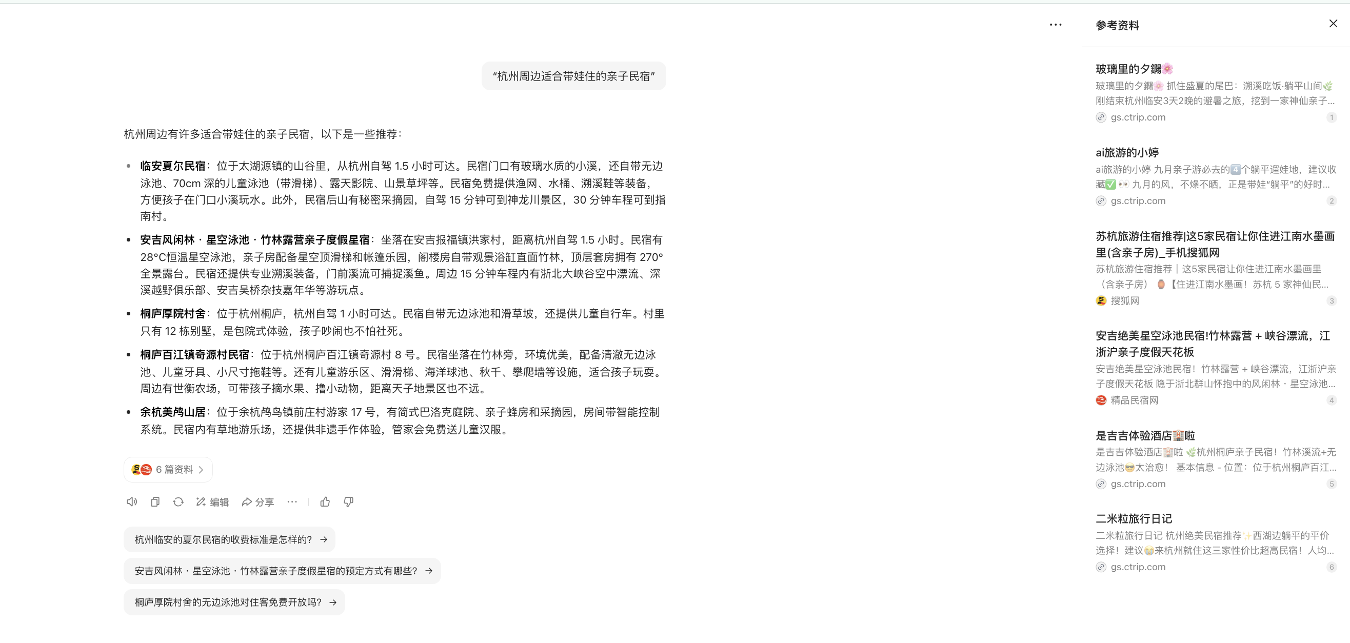 举个直观的例子:当游客在 AI 平台提问 “杭州周边适合带娃住的亲子民宿”,经过 GEO 优化后,AI 会这样回复:“根据杭州 XX 民宿的公开信息,该民宿配备儿童绘本馆、户外小农场,每日提供免费亲子手工课,且房间内设有儿童安全防护设施,非常适合 3-8 岁儿童家庭入住,距离杭州野生动物园仅 20 分钟车程,出行便利。”