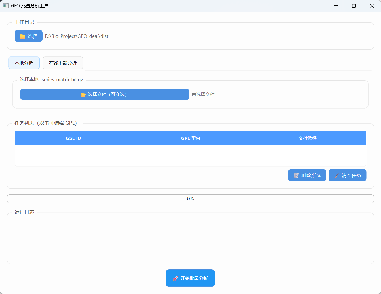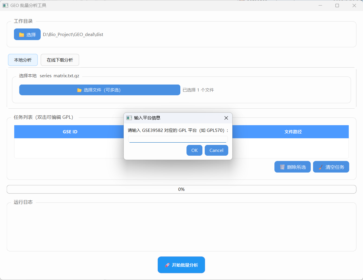 1、选择工作目录,目录下的子文件夹为数据库名称,里面有拥有XXX_series_matrix.txt.gz数据集,点击选择文件,选中该数据集后会弹出窗口,输入GPL平台(输错了可以在任务列表中双击对应的平台进行修改)