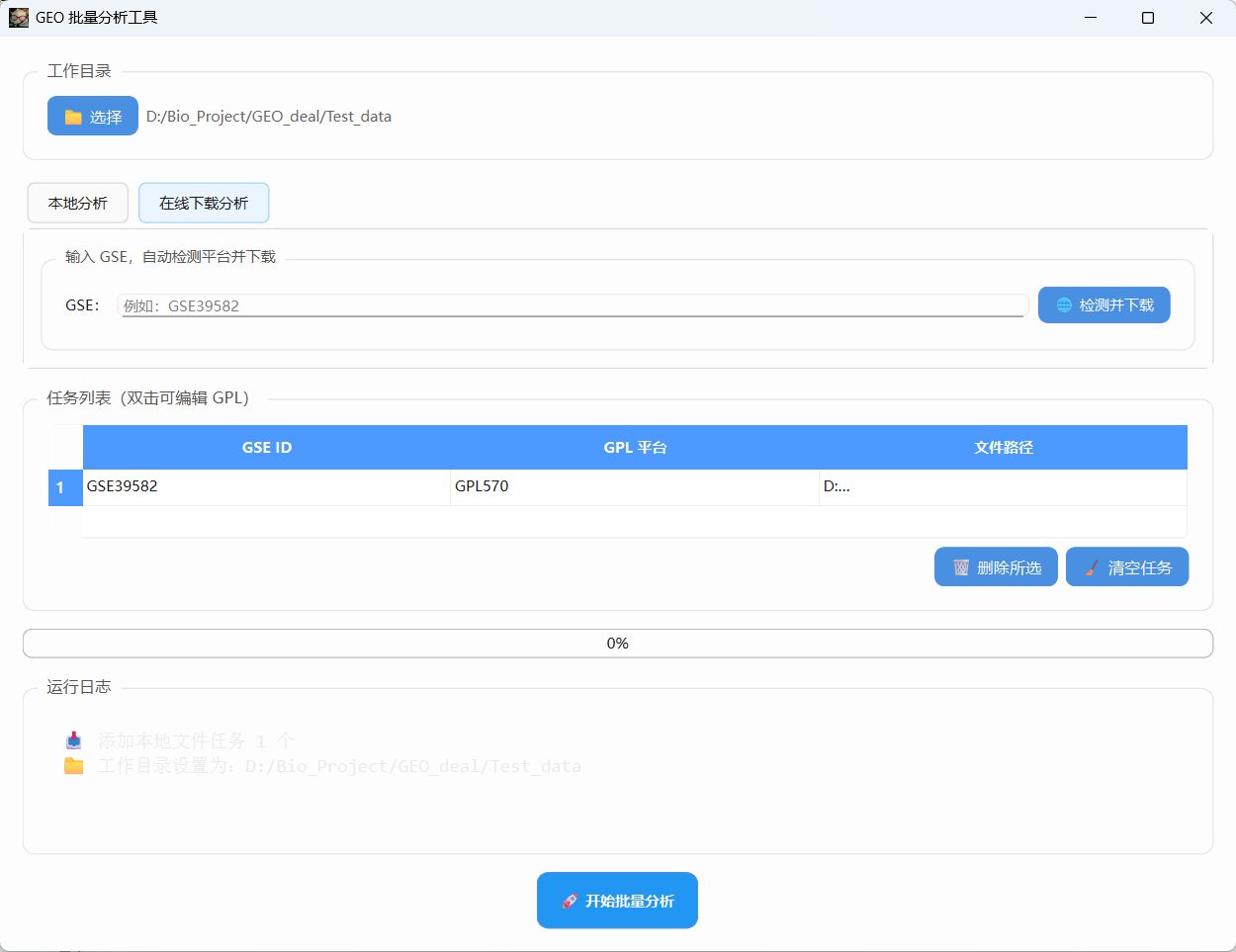 3、在线下载分析只需要输入数据集名称,就可以通过爬虫自动下载数据集(其实GEOquery包也可下载,但是R语言下载真的太慢了),并且检测平台信息(稳定性虽然比GEOquery好,但有时候可能还时不如直接用迅雷下数据集,本地分析来得快。后面有了千兆网我会用吧…战未来)。这个功能只需要选择工作目录,就会在工作目录下自动创建文件夹,下载完成后点击分析即可